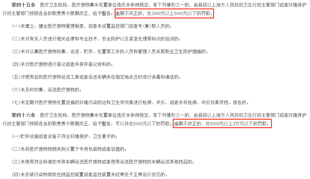 这个也是有据可依的。根据《医疗卫生机构医疗废物管理办法》规定,如果出现医疗废物管理失当的行为,应责令限期改正,给予警告;如果逾期不改,予以一定罚款。如果没有及时收集、运送医疗废物的,将处2000元以上5000元以下的罚款;如果贮存设施或设备不符合要求,将处5000元以上3万元以下的罚款。