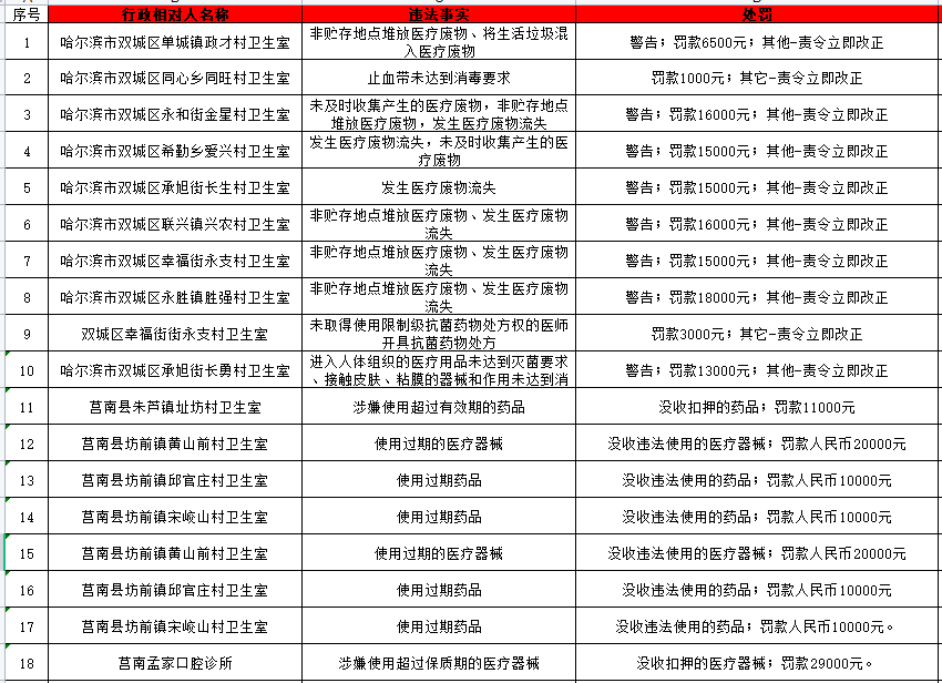 4月20日哈尔滨市双城区当地10家村卫生室因违反规定,被处1000~18000元的罚款,其中有7个罚单金额超1万元。
