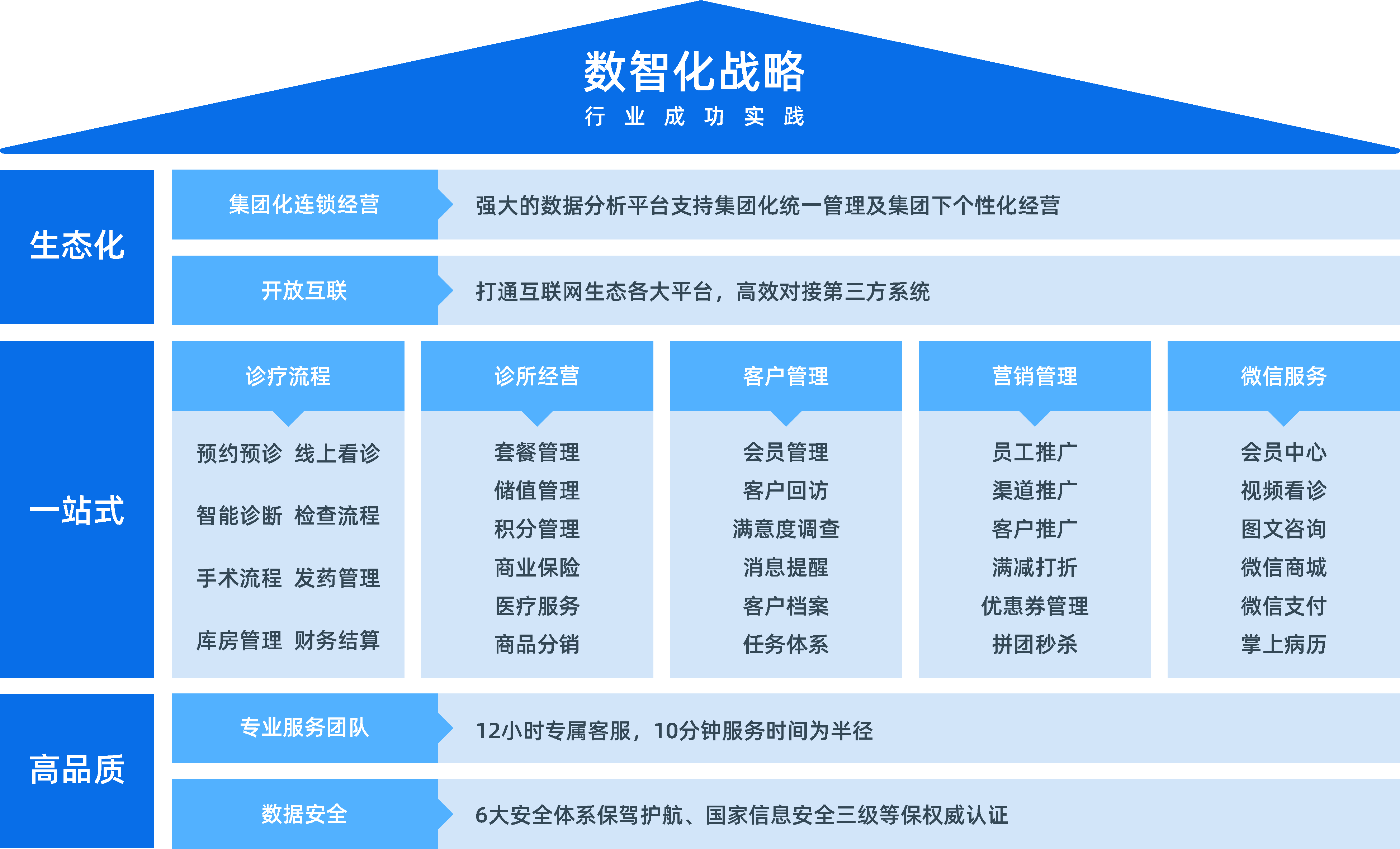 集预约挂号、诊所经营、支付缴费、医保商保、库房财务、客户管理、营销管理、微信服务于一体,兼具集团管控、数据分析、多系统对接等强大功能。